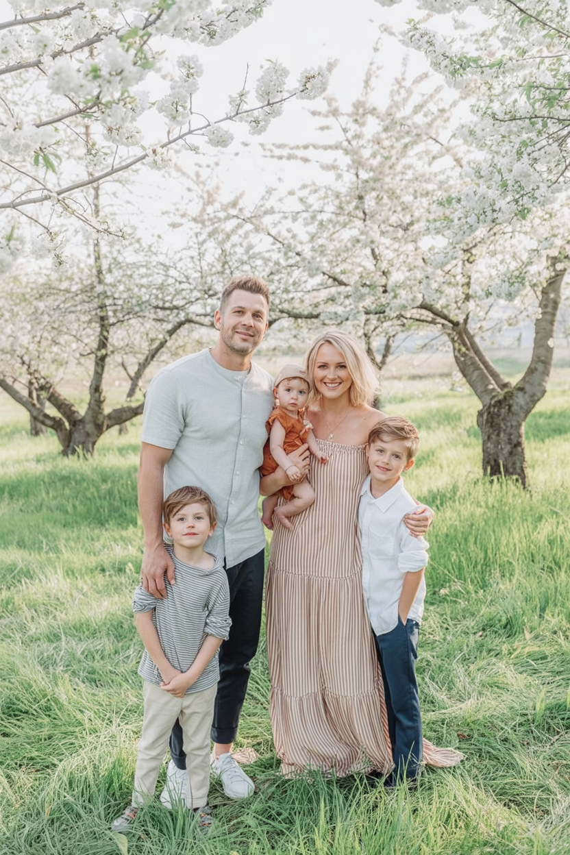 This is a great example of simple spring inspo that works especially well for casual outdoor sessions. Neutral tones keep the focus on faces and interaction, while comfortable fits make it easy for kids to move and stay happy during the shoot.