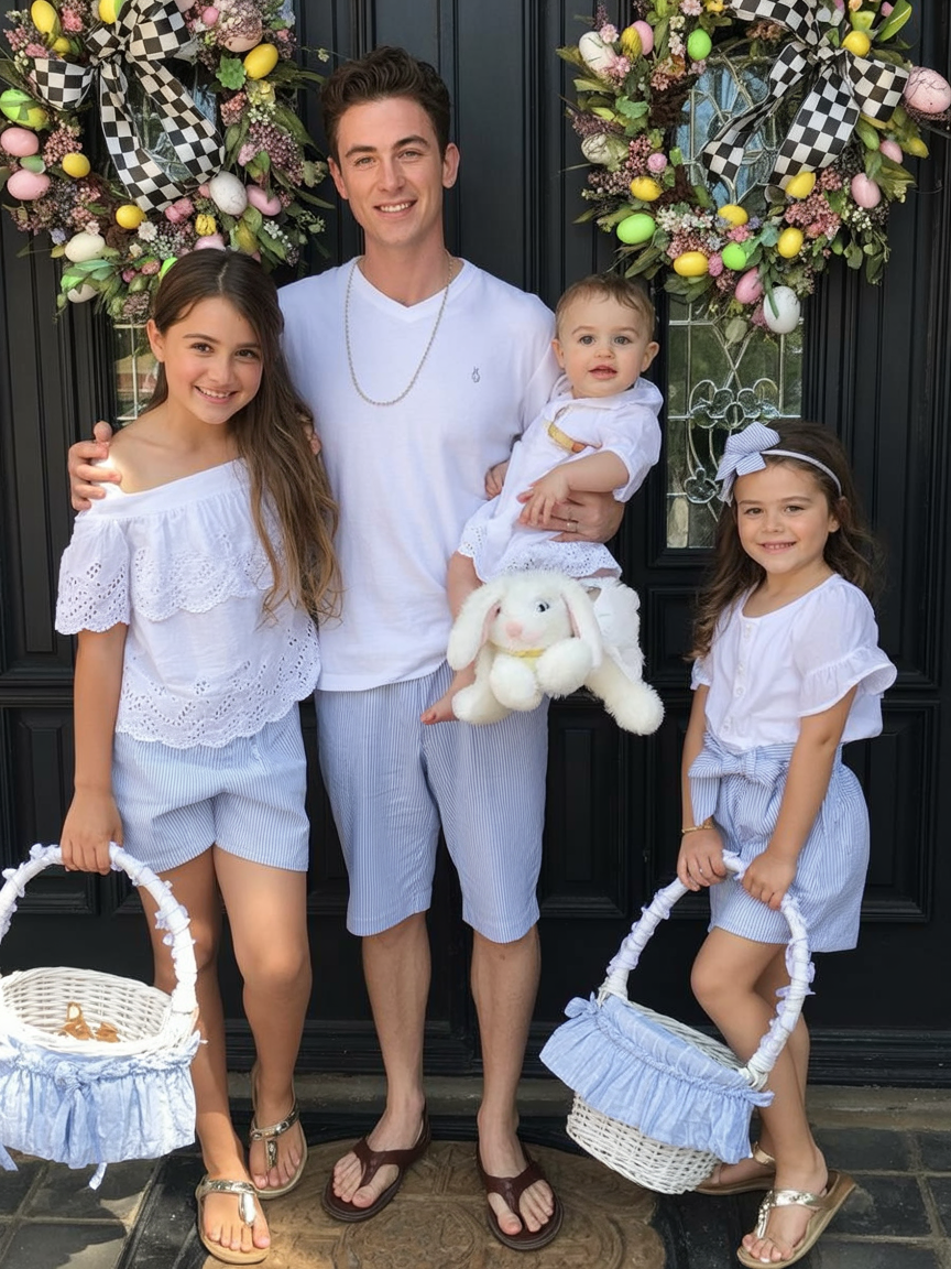 This look feels cheerful, polished, and full of spring joy. Light blue paired with crisp white instantly creates a clean, festive mood that feels perfect for seasonal family photos. There’s a playful energy here, especially with the kids’ outfits, that keeps the overall style fun and approachable.