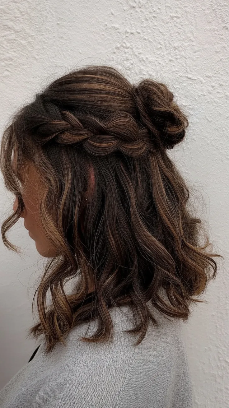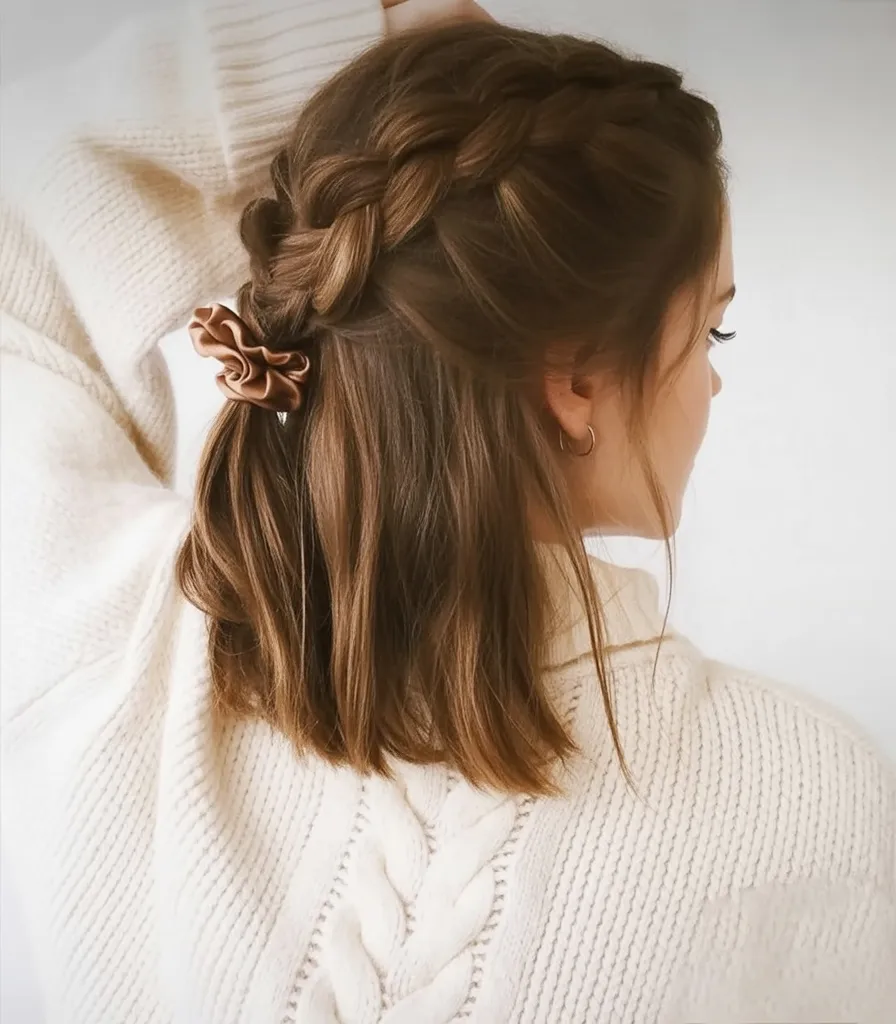 There’s a youthful charm to this braided half-up secured with a soft scrunchie. It’s playful without feeling juvenile, and it adds just enough detail to elevate a simple shoulder-length cut. The braid gives it structure, while the loose ends keep things approachable.