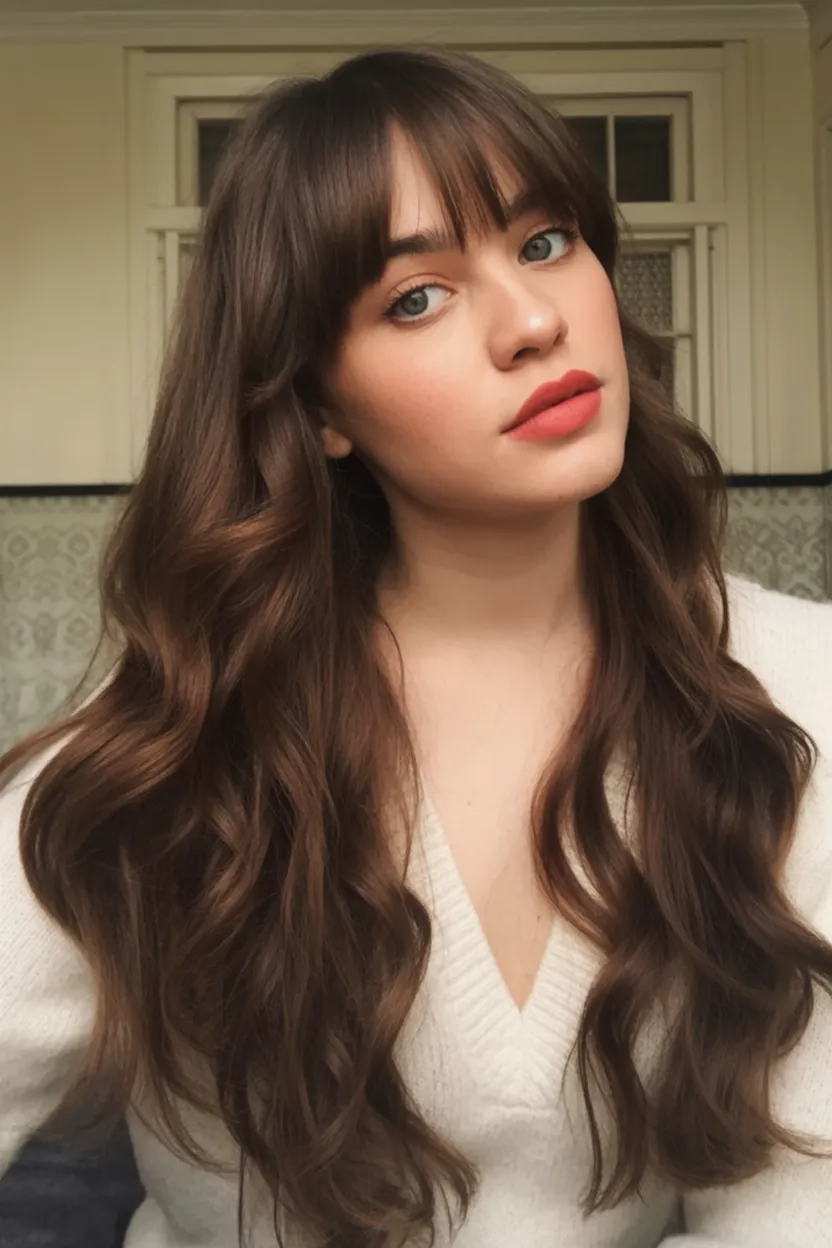 Soft bangs paired with long, flowing waves create a romantic, approachable vibe. It frames the eyes beautifully and adds just enough personality without feeling dramatic. This is the haircut that makes you feel refreshed—like you finally did something for yourself.
