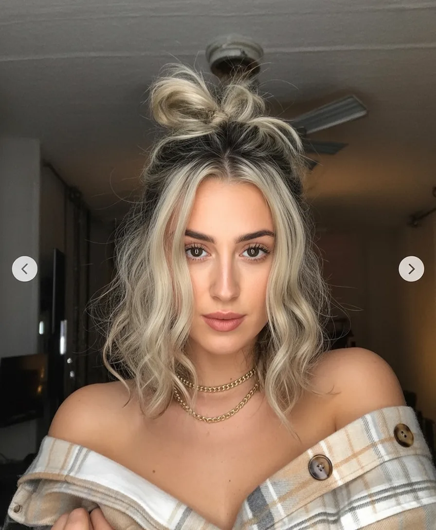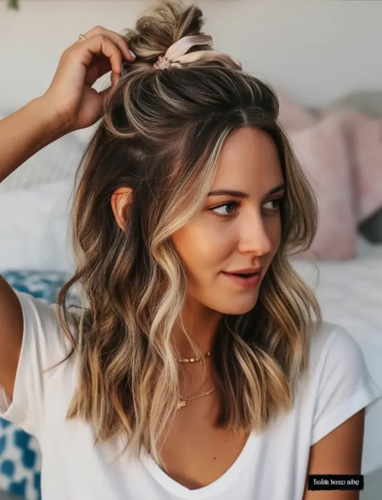 This half-up mini bun is understated but surprisingly chic. It keeps hair off your face while letting the rest fall naturally around your shoulders. It’s cozy, effortless, and perfect for those Stay at home afternoons when you still want to feel a little styled.