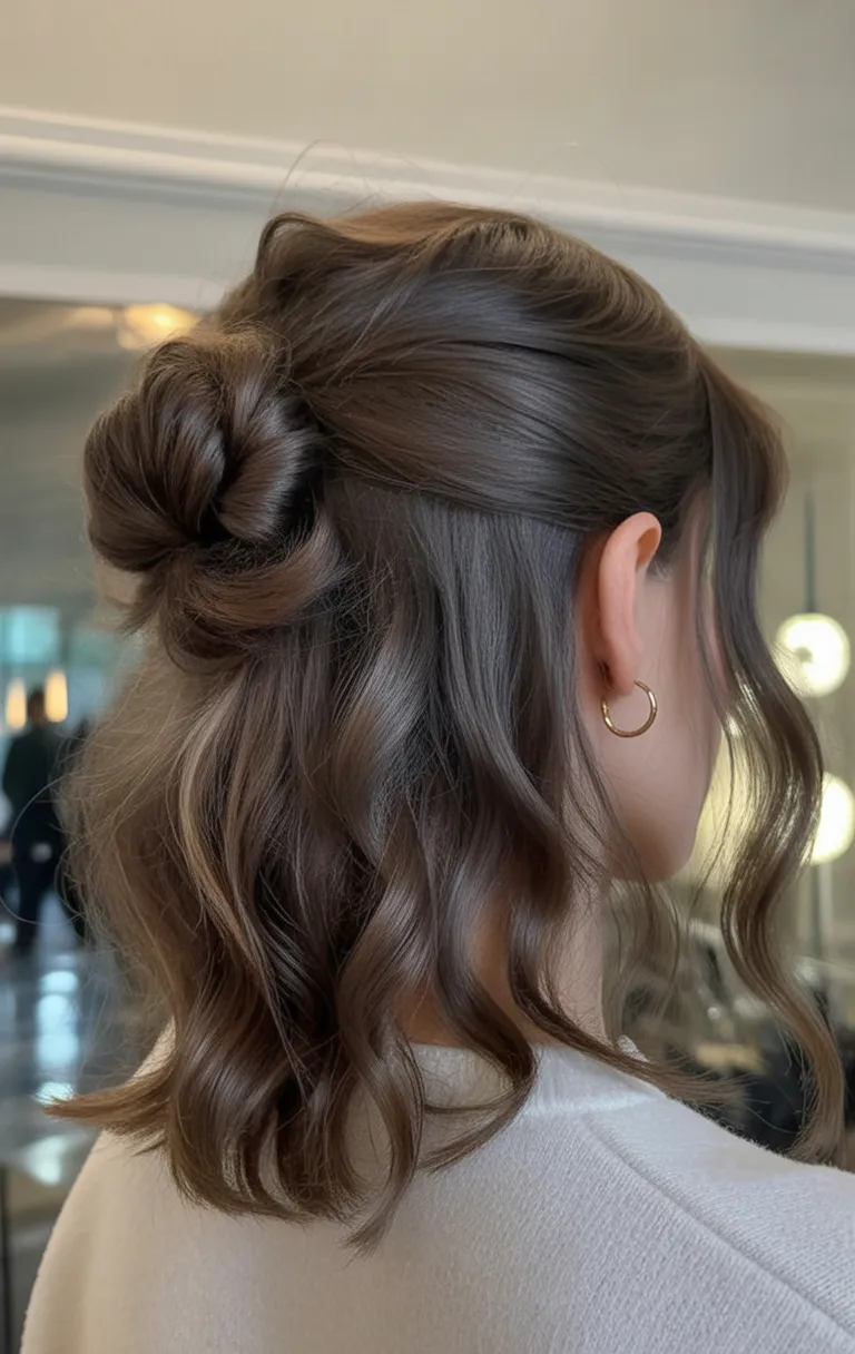 This half updo has that quiet elegance we all crave for special occasions. The soft twist at the back keeps things graceful, while loose waves add movement and warmth. It feels timeless, like something you’d wear to a wedding and still love in photos ten years from now.