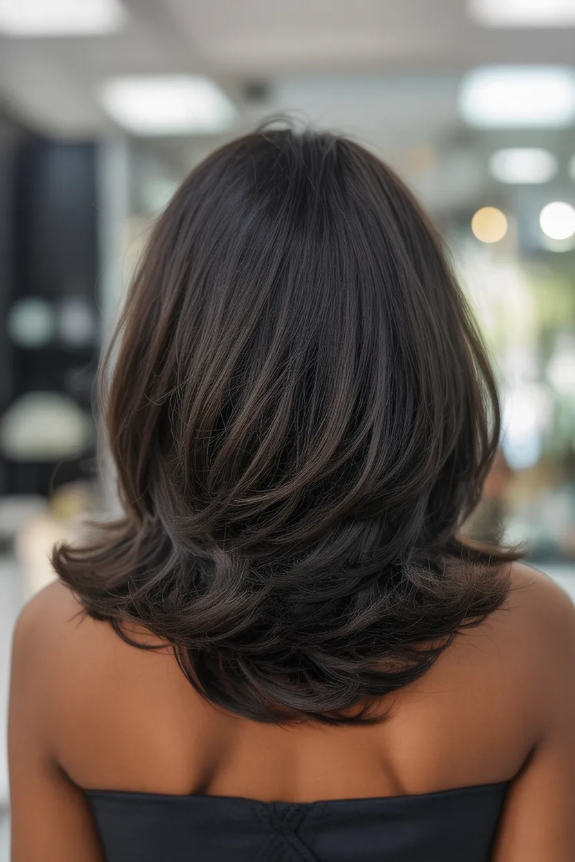 This medium layered cut has that glamorous salon finish we all adore. The soft flip at the ends adds body and movement, giving the hair a luxurious bounce. It’s polished but still approachable—perfect when you want to feel a little extra.
