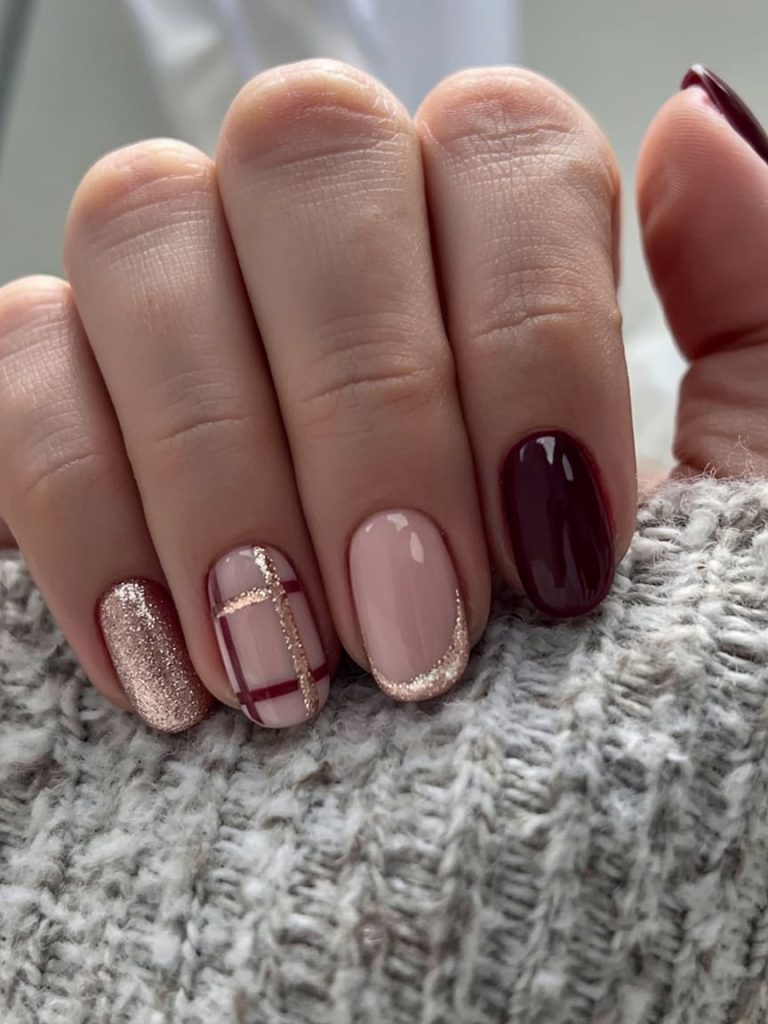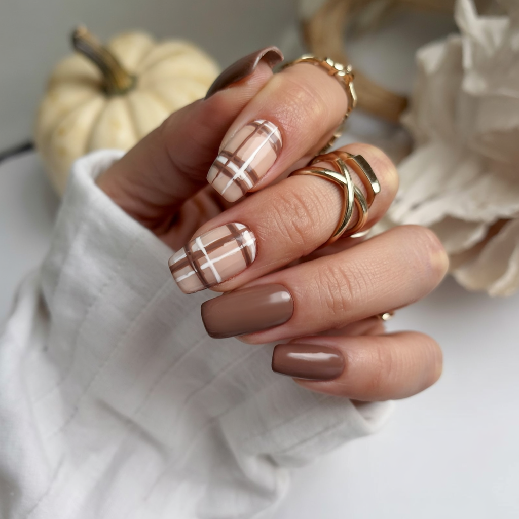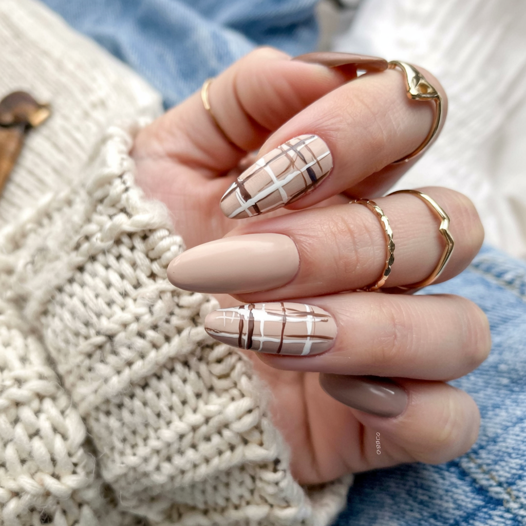 Just as tangibly as your favorite beige sweater and oat milk latte, this plaid style unites warm coziness with sheer style. The creamy and overall beige, taupe, and cream colors are earthy, relaxed, and comforting– appropriate for the seasonal changeover days when you want your nails to be well-groomed, but not fancy.