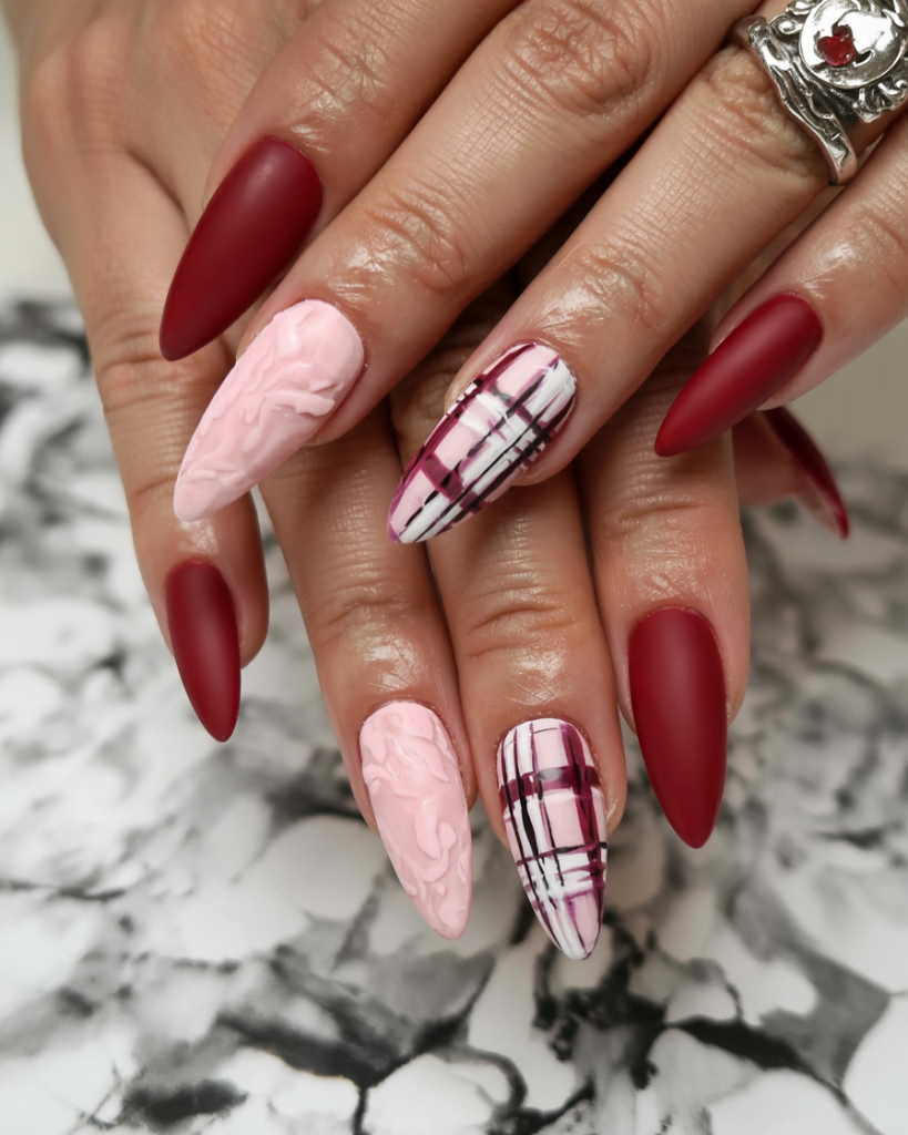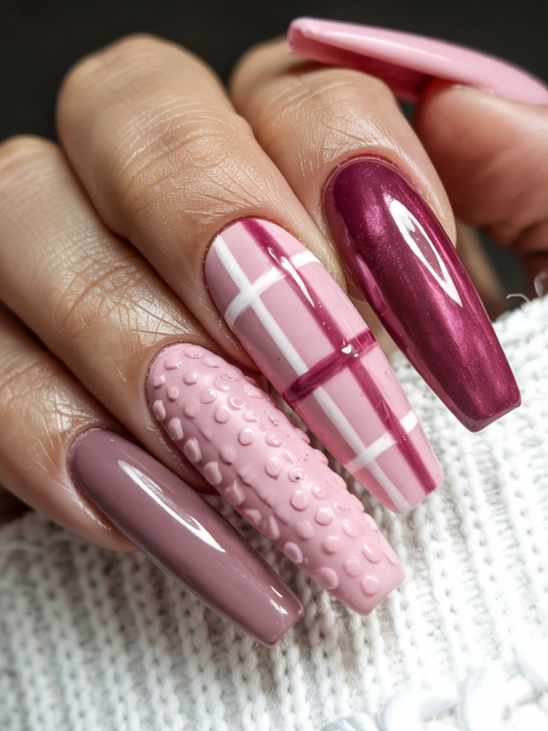 It is all just fun this one pastel pink and mauve with a shiny plaid focaccia and 3D textured 3D bumpy nail that is just unexpected. It is adorable and not childish owing to the combination of the finishes and elegant color combination.