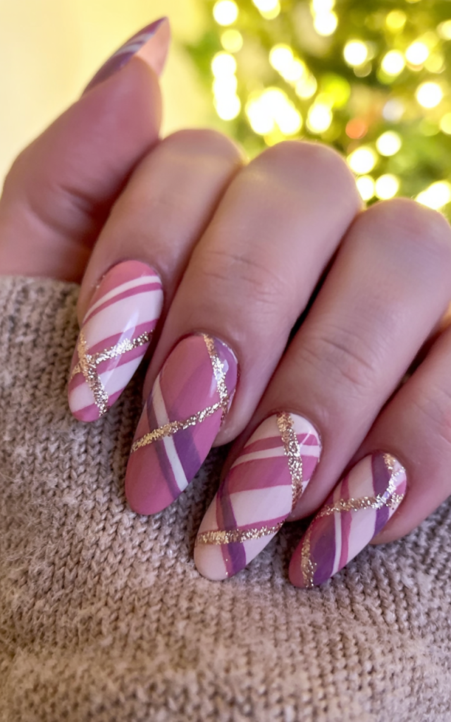 This is a celebratory fun of pink colors and shining gold. It probably means thinking candy canes with glam added in, or gift wrap you almost hate to unwrap. Deep pinks and soft pinks are criss cross-ed together with white and your Christmas morning feeling is all there ghosted with sparkle so that the Christmas magic abounds ever so just a bit extra.