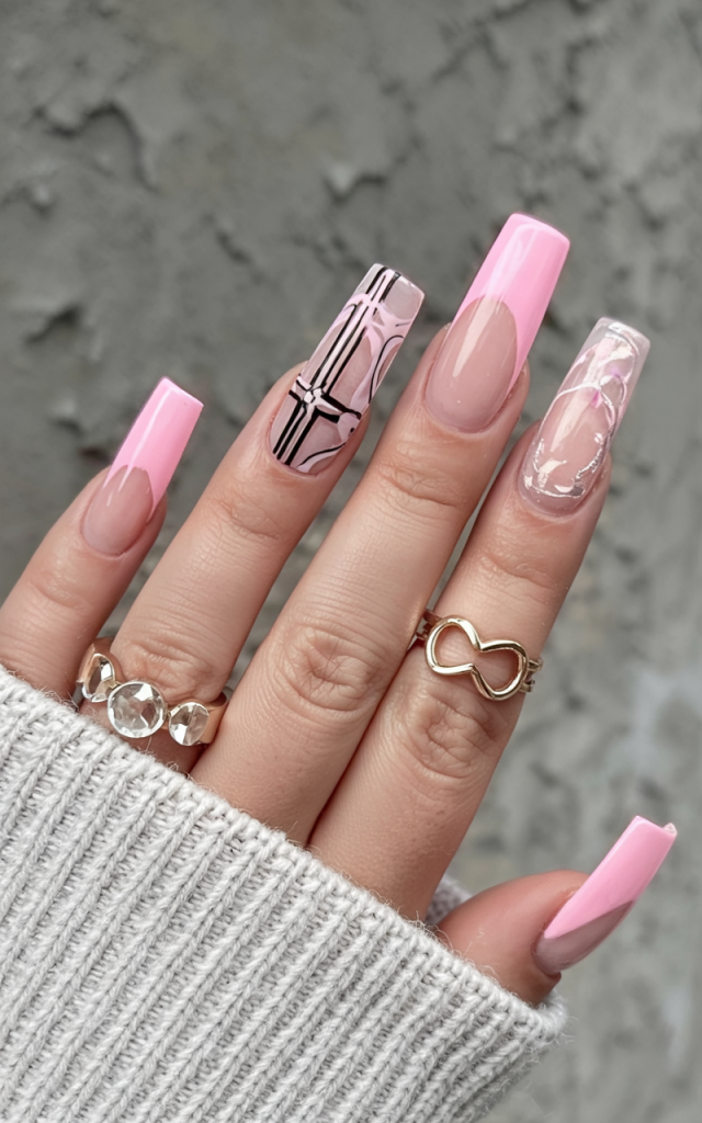 It is such a candy shop of FUN pink plaid. It is playful having its curvy French tip, abstract pattern and middle nail accentuated in plaid. It is as if you put some child at art school-think Barbie–the best way possible.