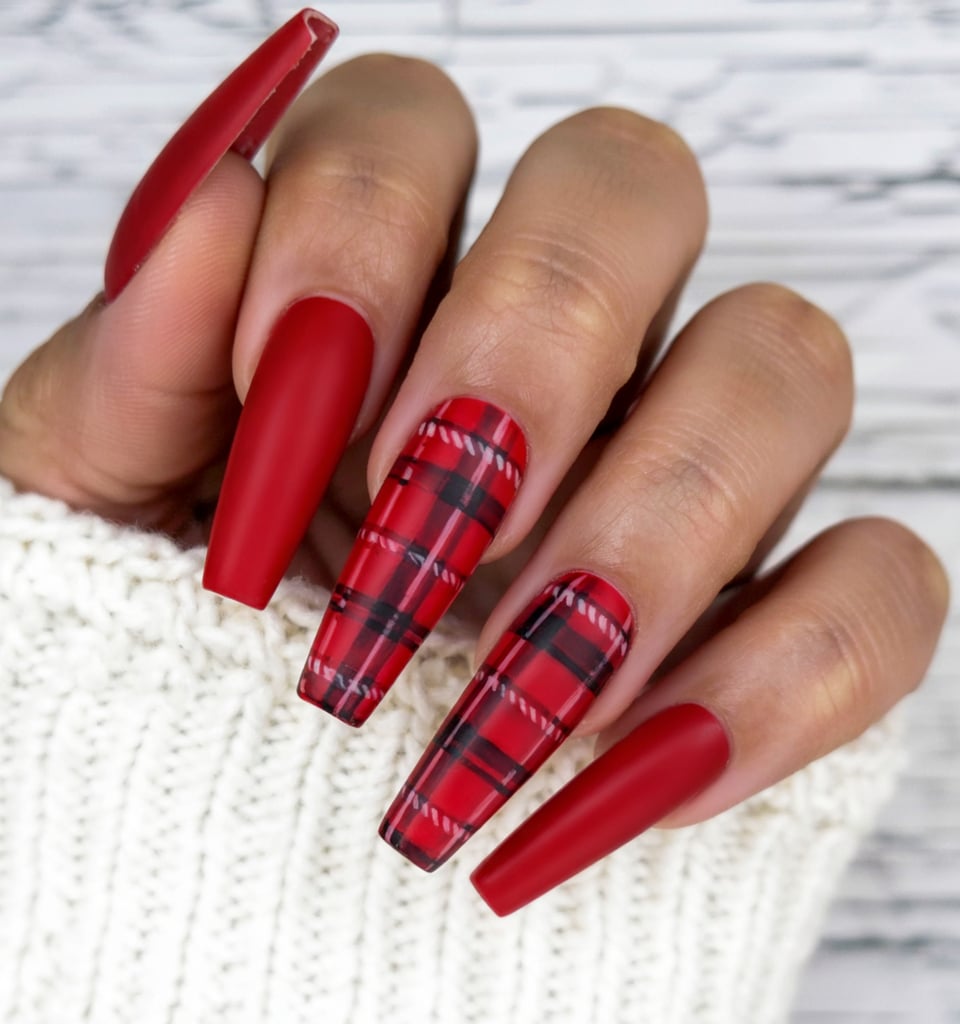 It is bold and festive as nothing can characterize this matte red and black plaid moment. It is dramatic in a good way, part candy cane, part lumber-jack, and part fashion editorial. These are nails that are the focus of attention, whether it is gifting packages or toast to a glass.