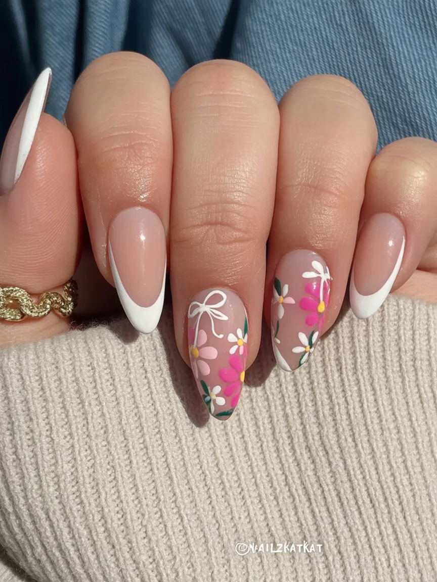 This manicure blends classic white French tips with soft pink and floral details, and honestly, it’s timeless. The bow accent adds a charming, slightly vintage touch that feels both fresh and familiar. It’s feminine, graceful, and beautifully balanced.
