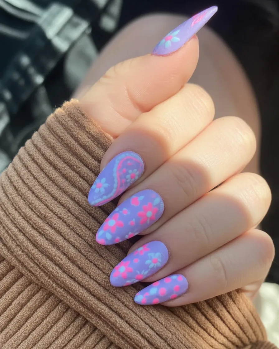 These Almond designs are perfect if you love mixing patterns and florals. The medium length keeps it wearable, and the pastel Colors make it ideal for spring wardrobes. It’s unexpected, stylish, and totally Inspo-worthy for 2026.