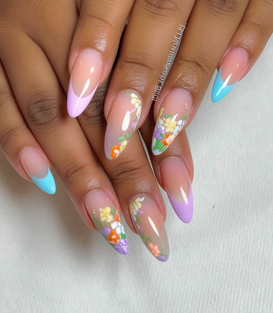 There’s something about soft florals on an almond shape that just feels like the first warm Saturday of spring. The blend of pink, lilac, and Blue tips over a sheer base looks fresh without trying too hard. It’s feminine, a little romantic, but still polished enough to wear to brunch, the office, or a weekend getaway. These almond designs are pure Inspo if you want your nails to whisper “I’ve got my life together” while still feeling playful.