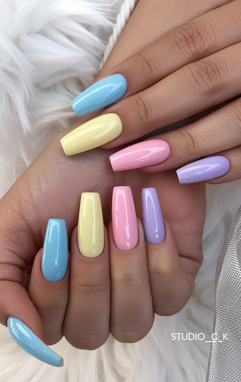 These long coffin nails in soft pastel Blue, pink, and yellow feel like a candy-colored daydream. The glossy finish keeps them sleek and modern, while the mix-and-match palette adds personality. It’s sweet, polished, and just a little dramatic in the best way.