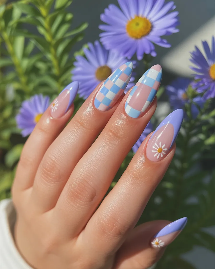This playful checker pattern in soft Blue and pink is giving cool-girl energy with a sweet twist. Paired with tiny daisies, it feels fresh, modern, and just a bit artsy. It’s the kind of manicure that sparks conversation without screaming for attention.