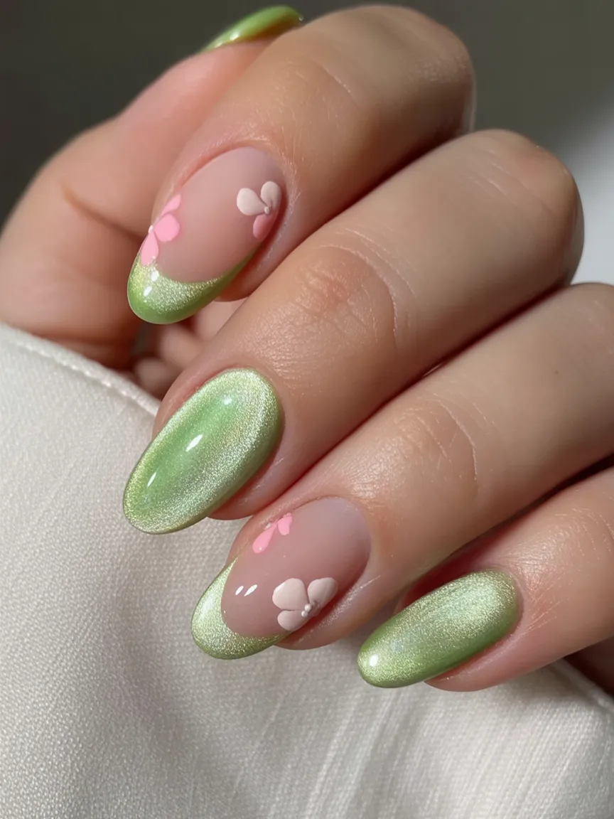 Muted Green with tiny pink blossoms? Yes, please. This look feels calm, grounded, and quietly Girly without being over the top. The subtle shimmer in the Green polish gives it depth, while the soft floral accents keep it light and seasonal. It’s the kind of manicure that makes you want to slow down and savor your morning coffee.