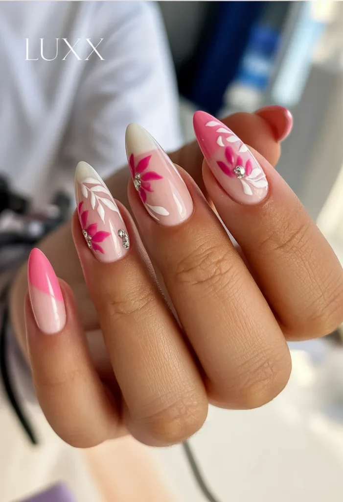 Soft pink fades, crisp white tips, and delicate floral detailing with tiny crystals—this almond set feels elegant and feminine without crossing into overdone territory. It’s romantic, polished, and absolutely timeless. These Designs 2026 prove that pink will never go out of style.