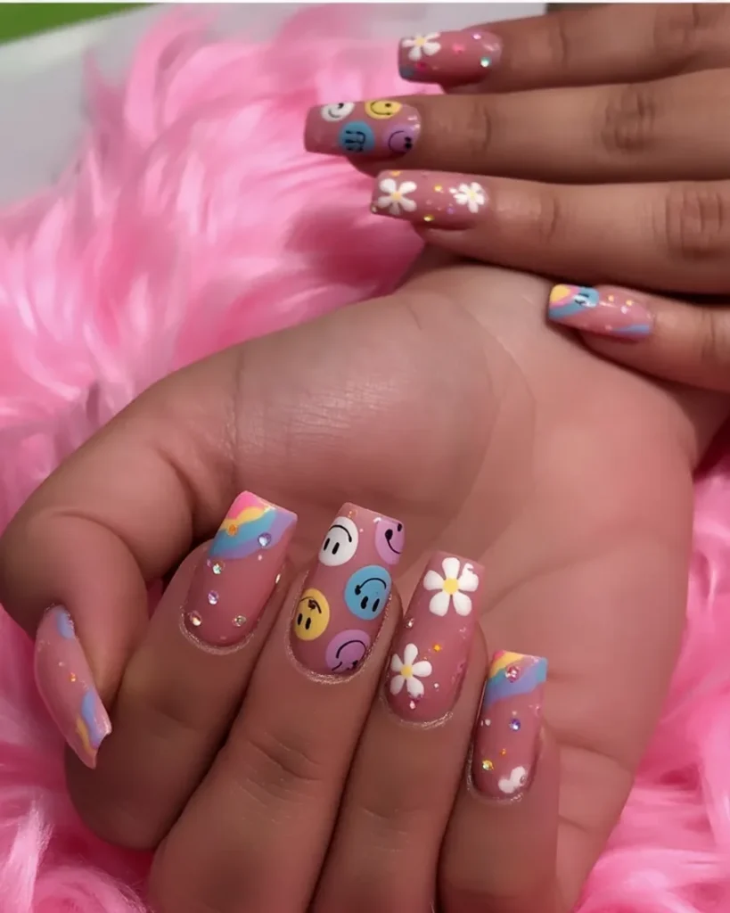 Tell me this doesn’t make you smile. The playful mix of pastel swirls, tiny daisies, and happy faces instantly brings back that carefree, early-2000s energy—but in a grown-up way. These Cute square short nails are fun, nostalgic, and just a little rebellious in the best way.