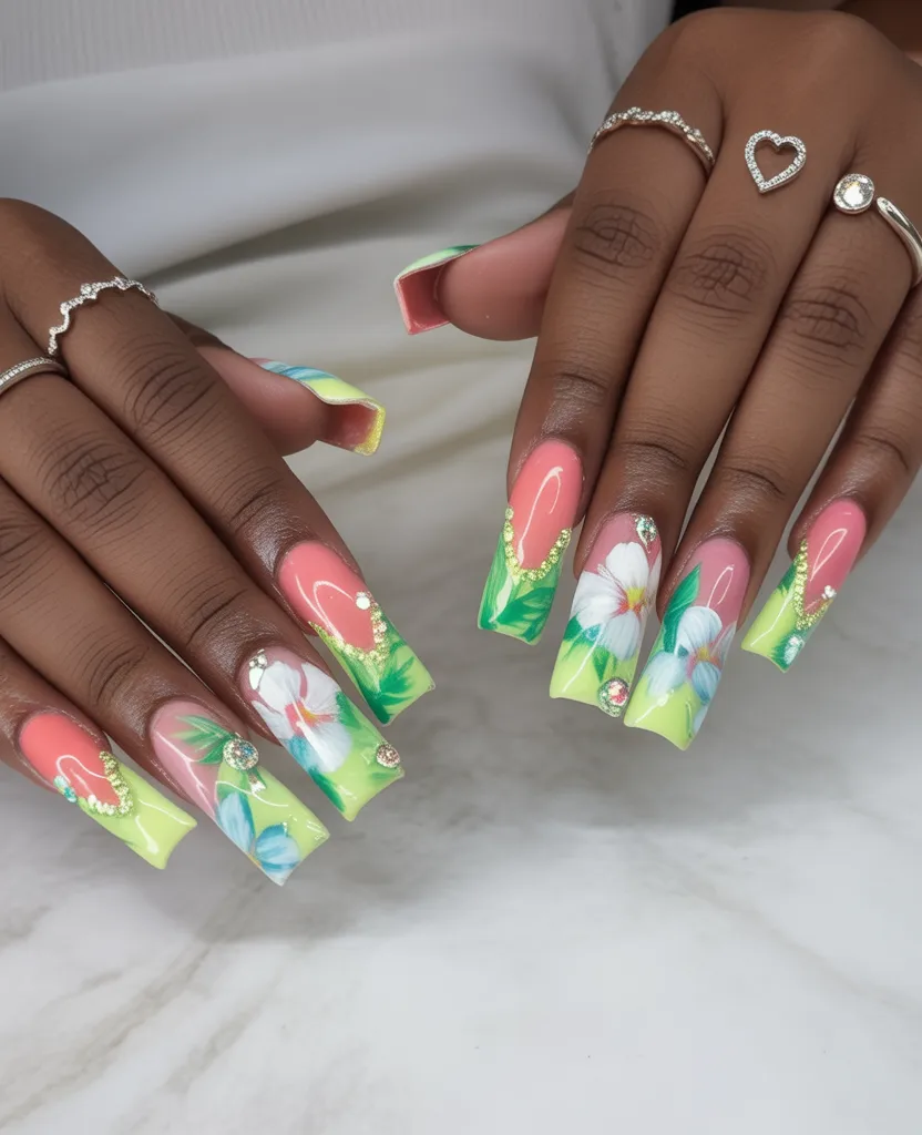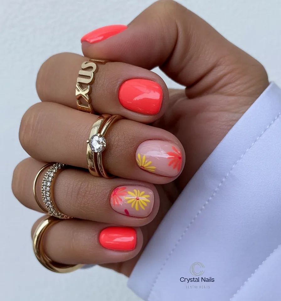If you’re craving something bold but still seasonal, this vibrant coral with dainty floral accents hits the sweet spot. The mix of Bright polish and soft nude bases keeps it balanced. It’s confident, a little flirty, and perfect for showing off stacked rings and sun-kissed skin.