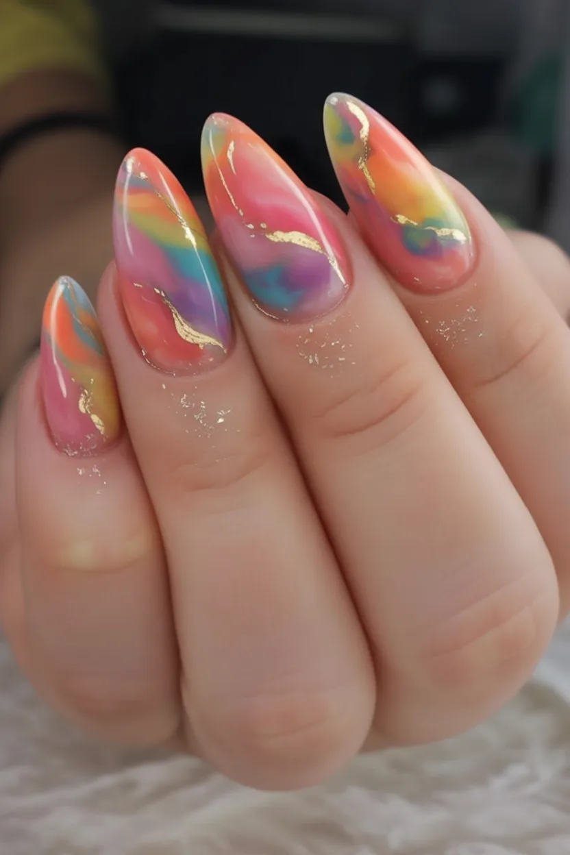 This one feels like wearable art. Soft washes of coral, pink, and Blue blend together with delicate gold accents that catch the light in the prettiest way. It’s creative, expressive, and totally unique—the kind of manicure that makes people grab your hand for a closer look.