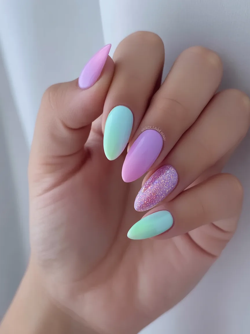 Soft mint Green, baby pink, and a hint of glitter come together in this dreamy pastel set. The matte finish gives it a velvety look that feels modern and slightly unexpected. It’s subtle but still eye-catching—like spring in nail form.