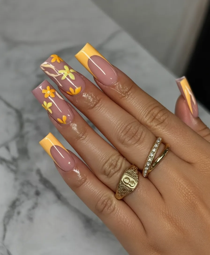 A buttery yellow French tip on a long square shape feels crisp, sunny, and just a little unexpected. Add delicate floral accents, and you’ve got a fresh twist on a classic. It’s clean and polished and gives that “put-together but not trying too hard” vibe.
