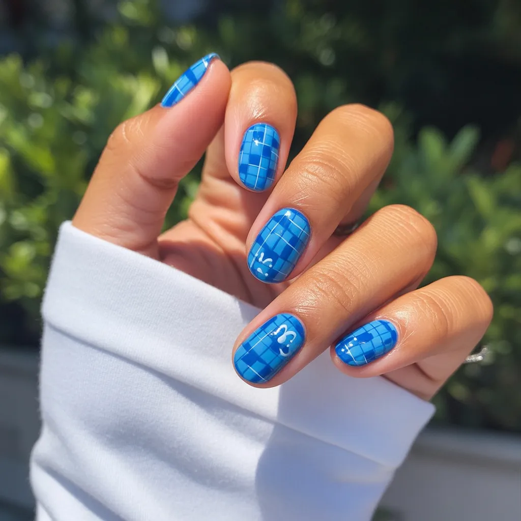 This glossy Blue grid design feels unexpectedly cool for spring. It’s clean, graphic, and slightly sporty—like your favorite crisp button-down turned into nail art. There’s something so satisfying about the neat lines against that rich Blue base. It’s minimal but not boring.