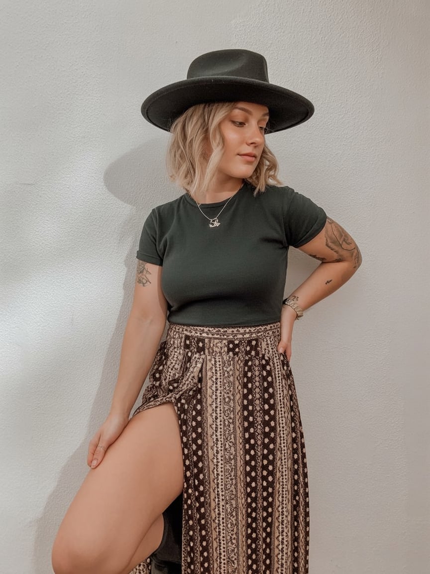 2. Boho Skirt and Hat Combo with a Feminine Edge