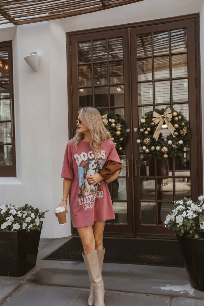 This look is all about relaxed confidence. An oversized tee worn as a dress feels effortless, while tall boots add structure and intention. It’s the kind of outfit that looks thrown together—but in the best possible way.