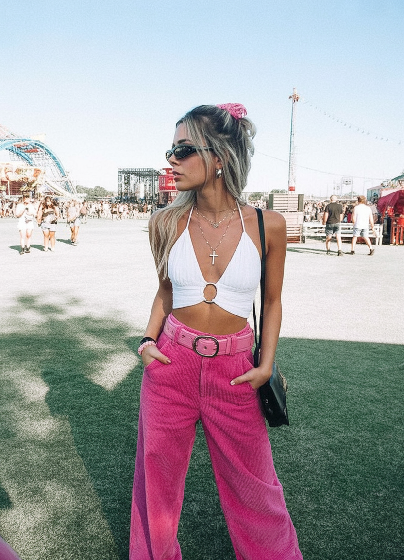 This outfit feels bold, playful, and full of personality. The contrast between the clean white top and vibrant pink pants creates a confident festival look that feels joyful and expressive. It’s the kind of outfit that makes you feel noticed—in the best way.