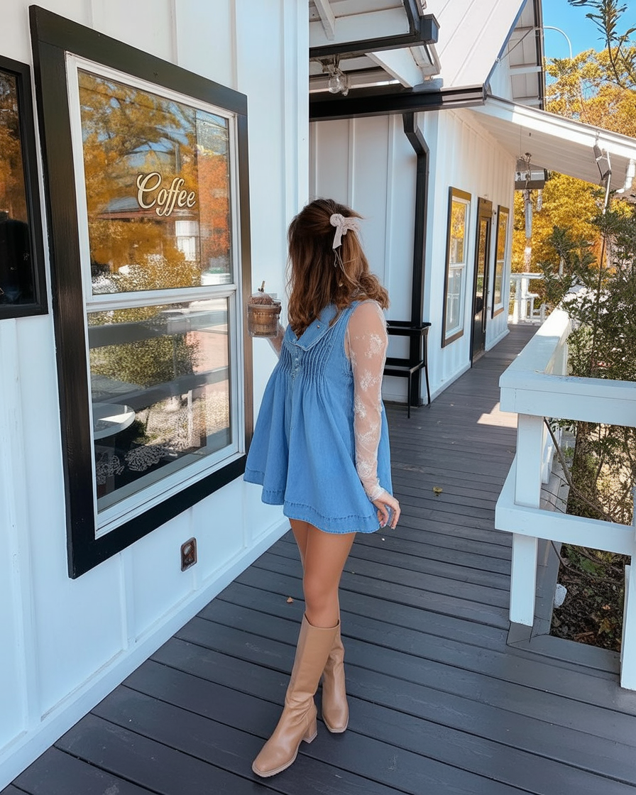 This look feels gentle and romantic, like something you’d wear for a slow morning coffee that turns into an afternoon concert. The denim dress is light and airy, while the boots ground the look with subtle Western influence.