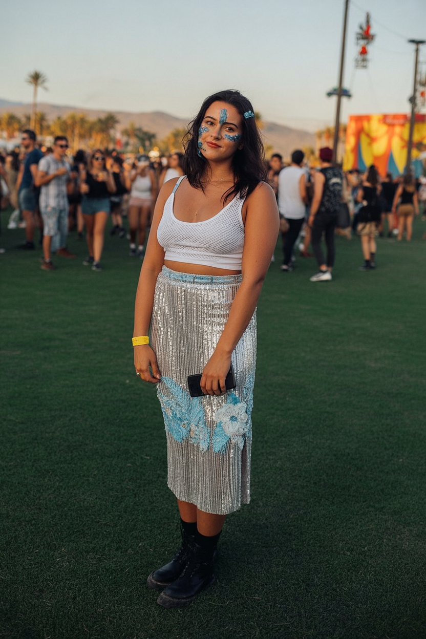 There’s a playful confidence in this look that feels perfect for festival-style concerts. The shimmering skirt paired with a simple top creates contrast that feels modern and expressive. It’s bold without being over-the-top.