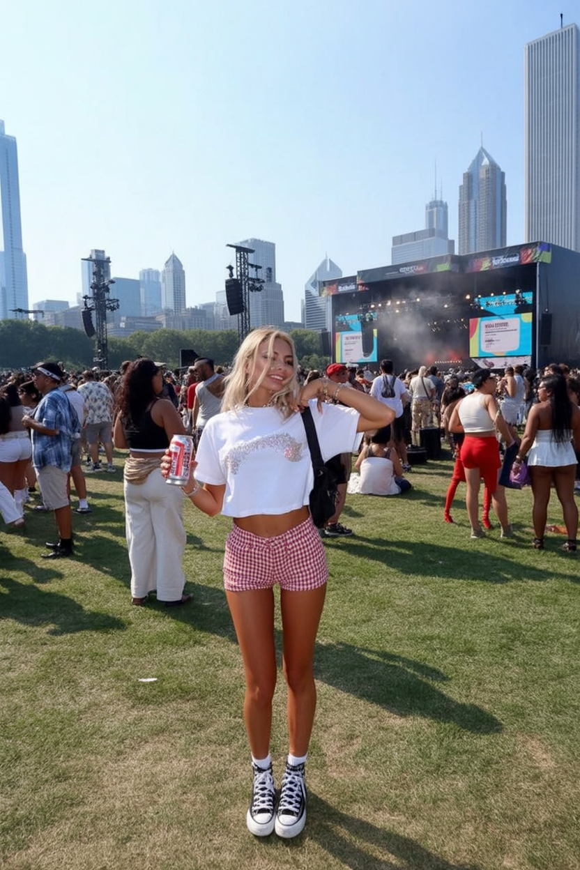 This look captures classic festival energy. A cropped tee paired with shorts feels youthful, fun, and effortlessly cool, especially in a lively outdoor concert setting. It’s playful without feeling overdone.