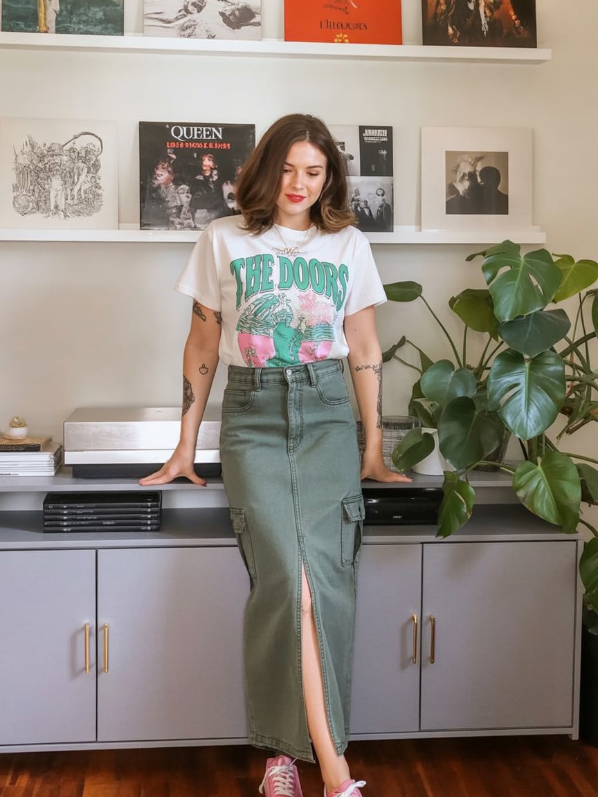 14. Vintage Band Tee with Utility Skirt for Retro Cool