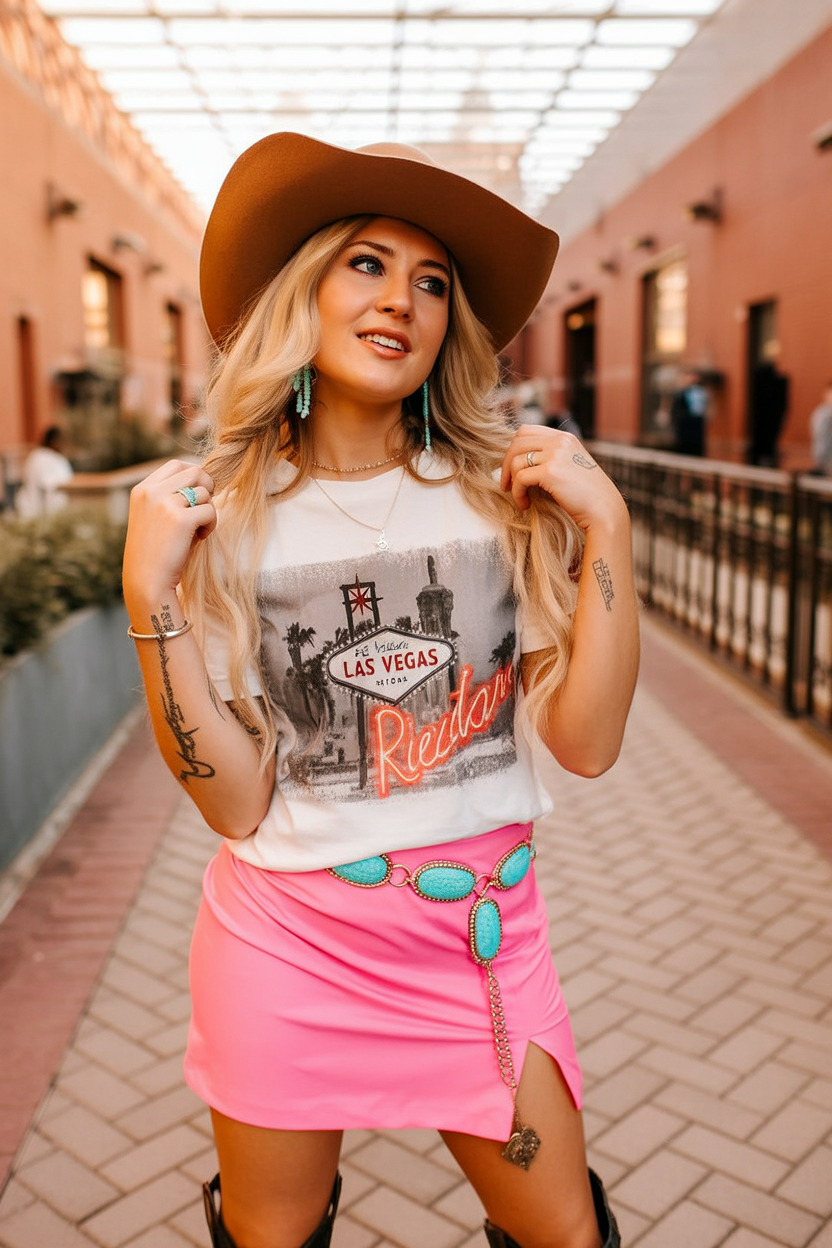 This outfit is playful, bold, and full of personality. The bright skirt immediately draws attention, while the graphic tee and Western accessories keep it grounded. It’s the kind of look that makes you feel noticed—in a good way—especially when music, color, and movement come together.