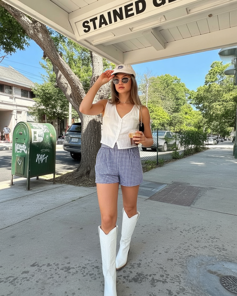 This outfit feels like pure spring freedom. The tailored shorts, sleeveless top, and white Western boots create a look that’s relaxed but still intentional, perfect for wandering between stages with a cold drink in hand. It has that confident, unfussy charm that works when you want to look cute without trying too hard, especially for outdoor shows that stretch from afternoon into sunset.