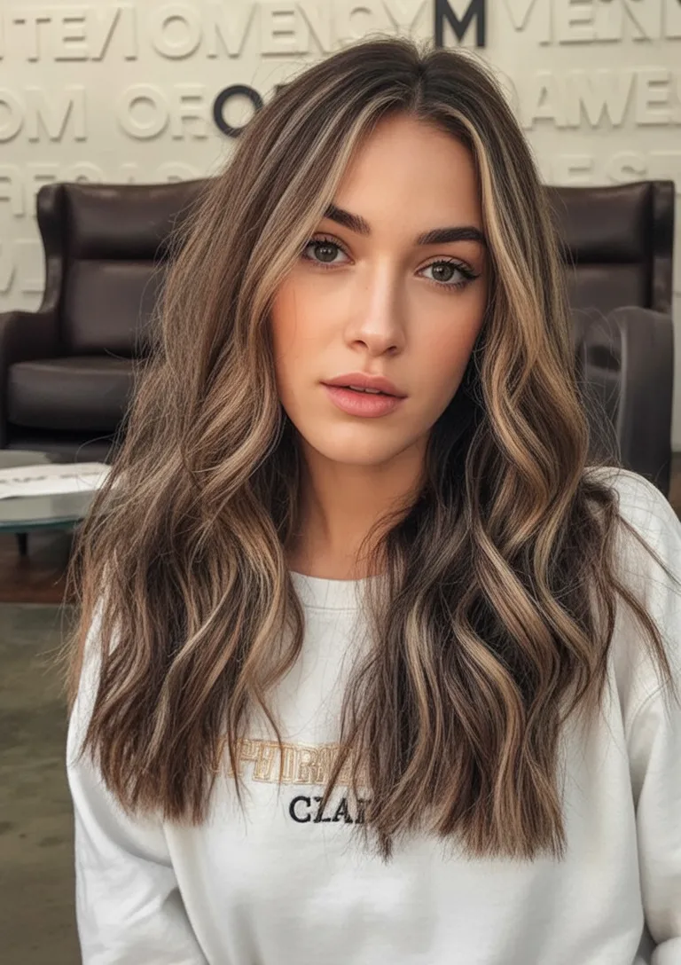 This style works beautifully for brunette hair with medium density. A large-barrel curling iron or soft wave technique enhances texture, while the color placement keeps maintenance manageable. It’s perfect if you want dimension without dramatic change.