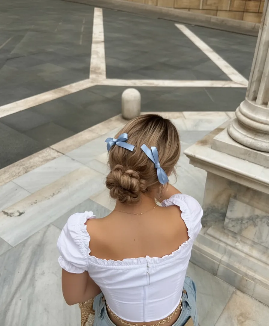 This hairstyle feels like a soft daydream—delicate, nostalgic, and full of charm. The low bun sits gently at the nape, while the ribbon accents add a subtle, playful detail that doesn’t feel childish. It’s graceful, feminine, and perfect for slower spring moments.