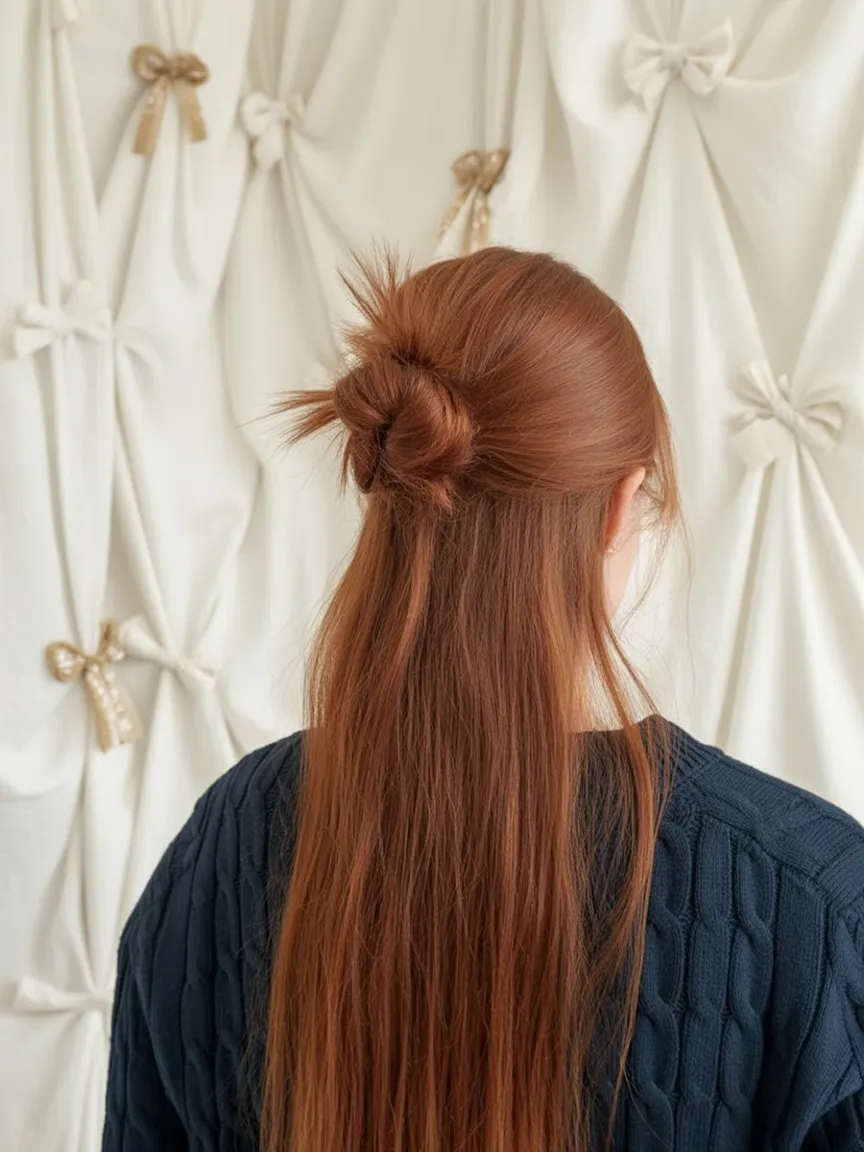 This hairstyle feels cozy, feminine, and quietly romantic—the kind of look that makes you slow down and enjoy the moment. The half-up knot adds a touch of charm without feeling overly styled, while the warm copper shade brings instant softness and glow. It’s simple, but there’s something very intentional about it, like an easy ritual you come back to again and again.