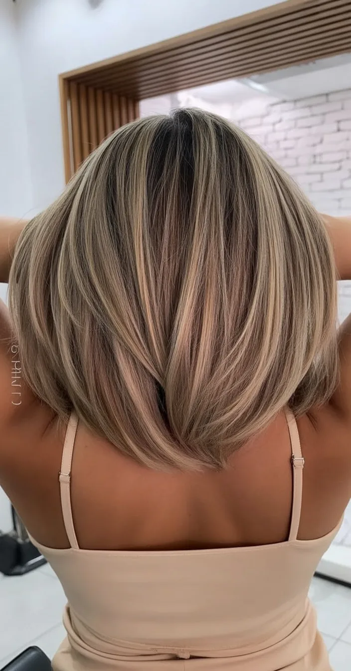 This style feels fresh, light, and very current. The layered bob creates movement and fullness, while the blended blonde tones add depth without harsh contrast. It’s effortless but clearly intentional.
