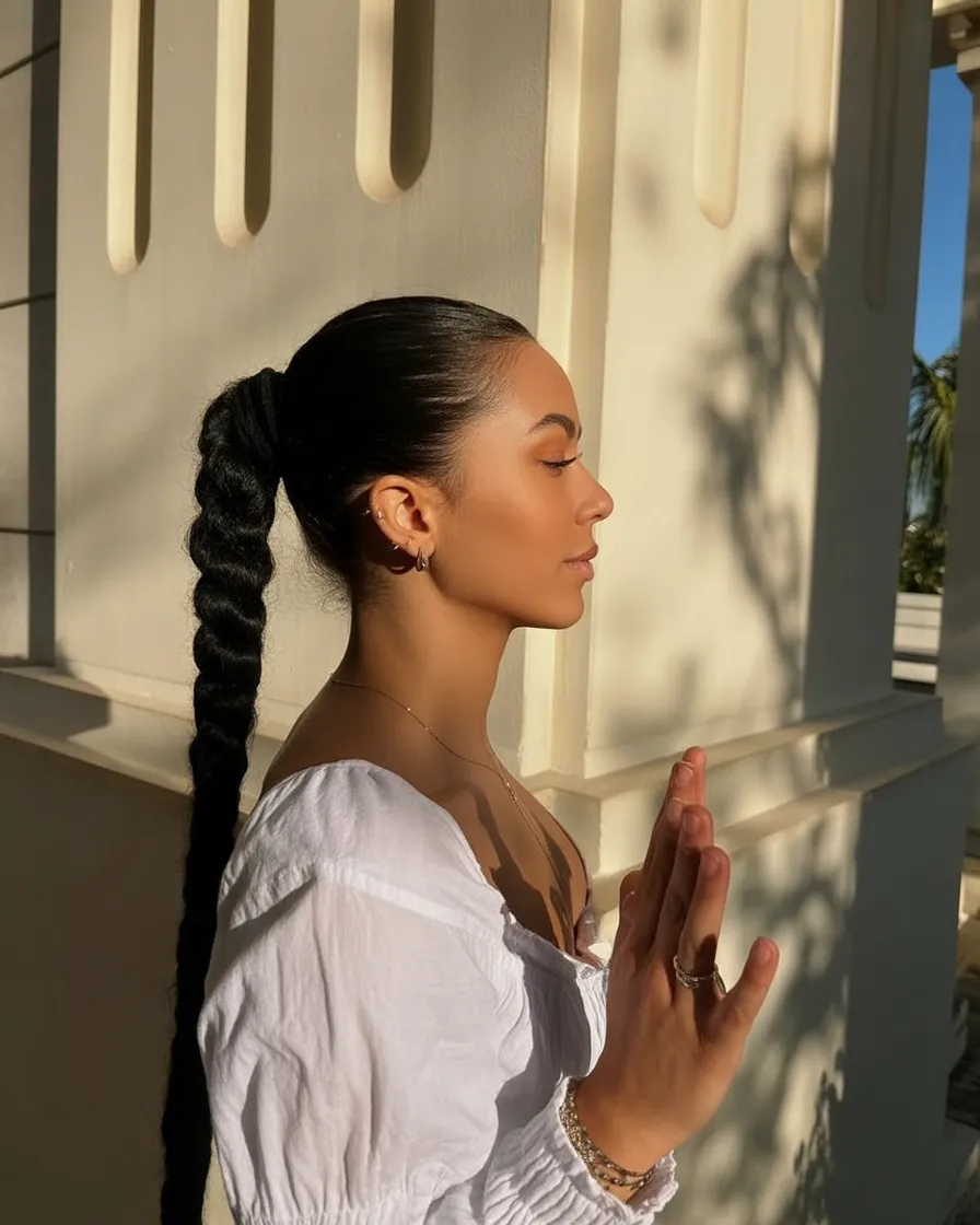 This braided ponytail is ideal for thick hair or naturally textured hair that holds structure well. It’s especially striking for Black women who want a protective style that still feels refined and elevated. A strong-hold gel at the roots keeps the finish sleek, while the braid itself does all the visual work.