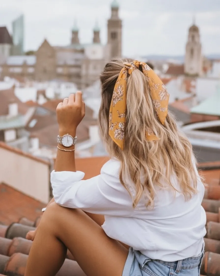 This hairstyle feels relaxed, sunny, and effortlessly stylish—like a perfect spring afternoon captured in one look. The half-up style keeps things casual, while the scarf detail adds personality and movement. It’s carefree without looking messy.