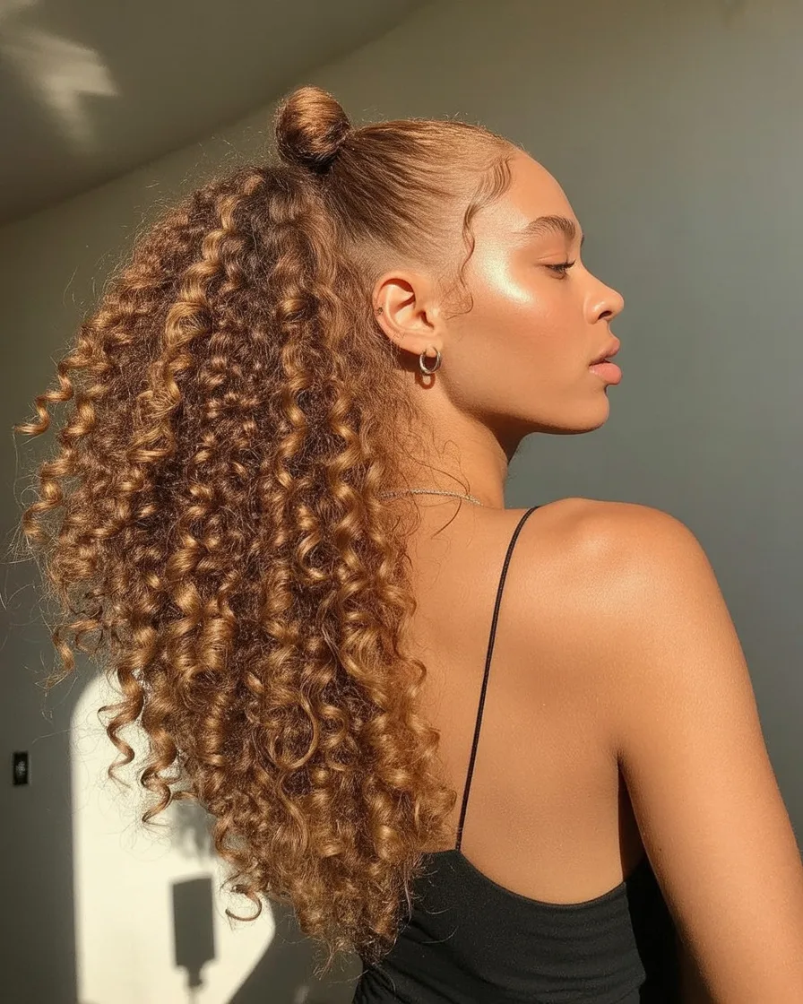 Perfect for curly hair, this style celebrates natural texture. Use a defining cream and secure the ponytail high to show off shape and bounce. It’s a great reminder that curls don’t need to be tamed—they deserve center stage.