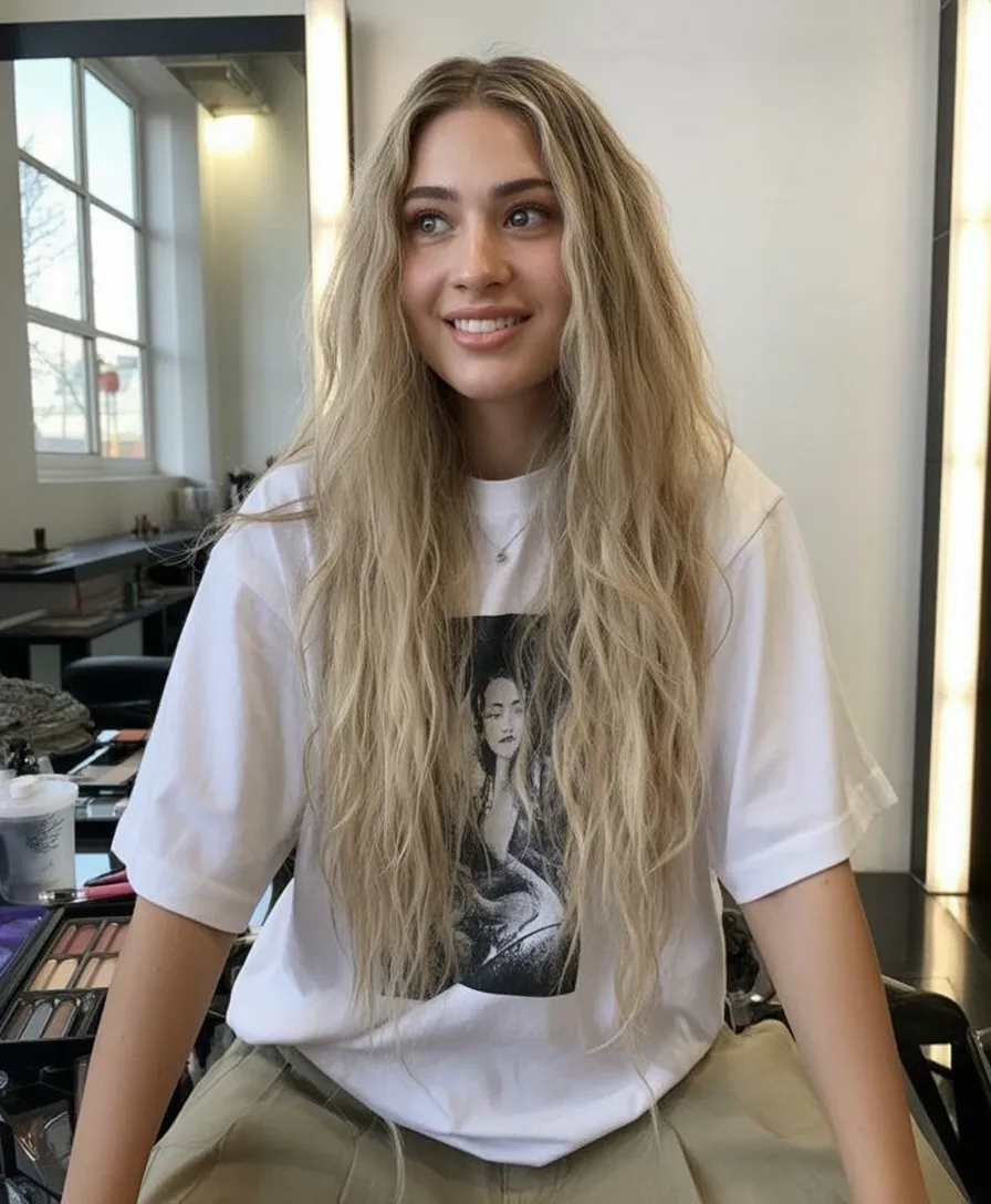 This look works beautifully on long hair with wavy or slightly curly texture. A lightweight curl cream enhances definition without stiffness, and gently pinning the top section keeps the style balanced. It’s ideal if you want movement, volume, and an easy everyday style that still feels polished enough for dinner plans.