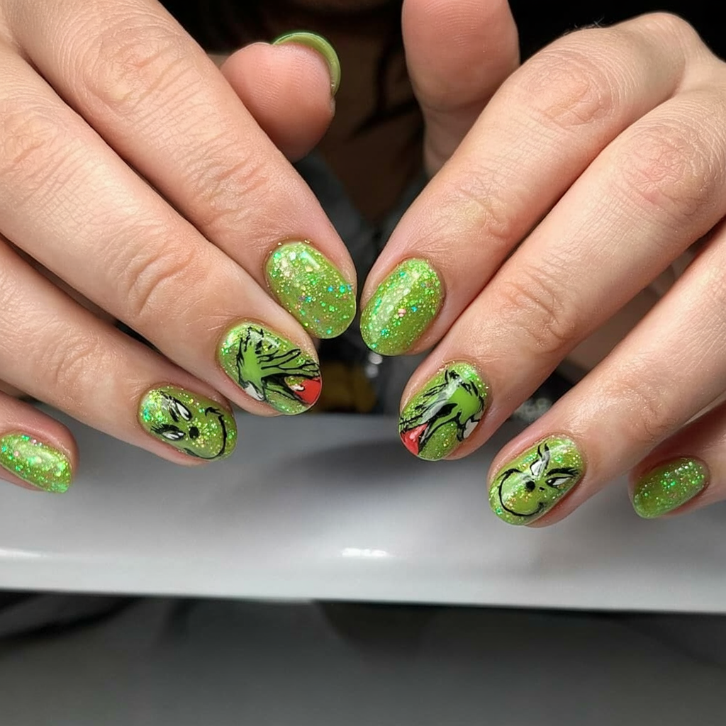 Playful and mischievous, these green glitter nails bring the Grinch to life. His grumpy face paired with the sparkly base makes this design both cheeky and festive. It’s a nod to holiday classics while still feeling trendy and fun for 2025.