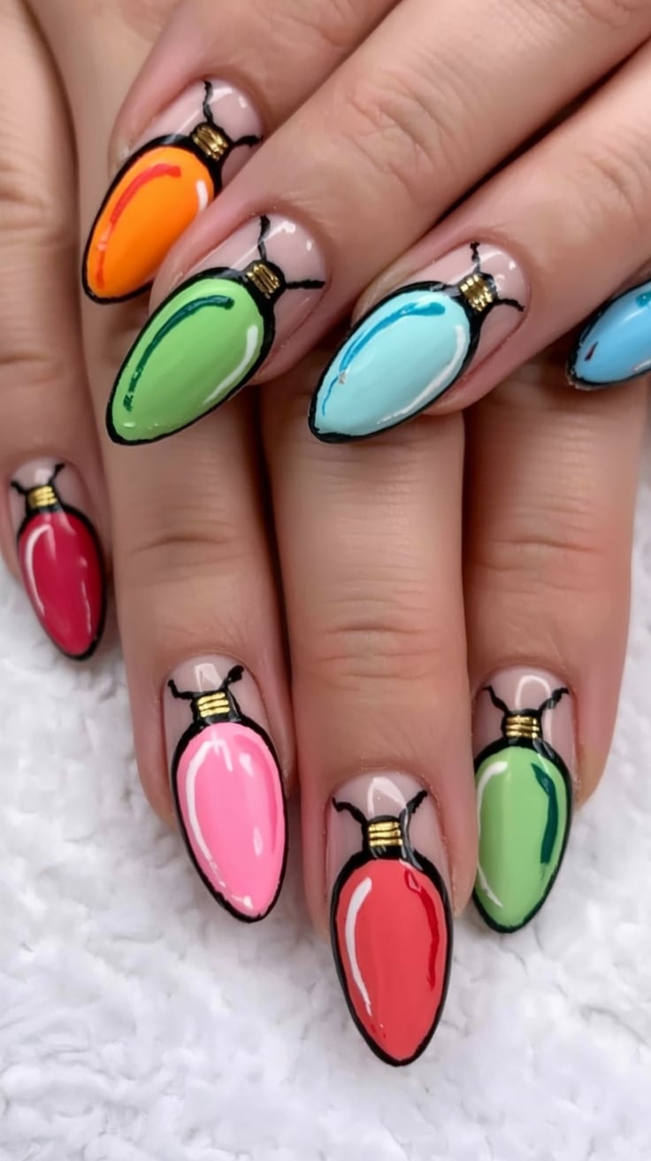 Nostalgic fun with bold, bright Christmas light nails. They feature the nails decorated with big bulbs in red, green, pink, blue, and orange, with a thick black outline that lends to a cartoon effect. Playful and attention-grabbing, they are sure to bring a smile to anyone who looks upon the manicure. A piece of holiday décor-anywhere-anyhow.