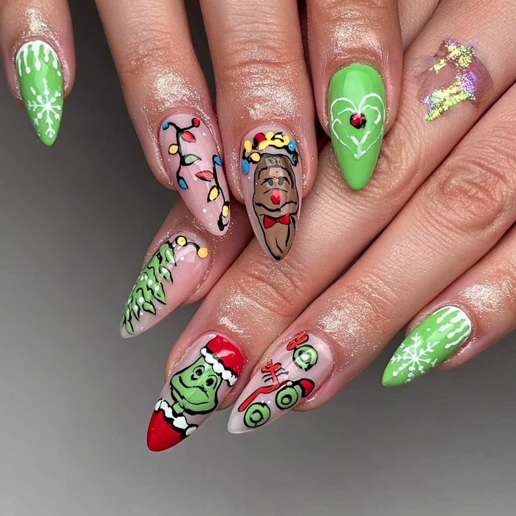 This is where dangerously playful chaos reigns supreme. From the Grinch in a Santa hat, to a reindeer, twinkling lights, and candy canes, we have a different holiday story on each nail. The vibrant green accents tie it all together with that unmistakable Christmas vibe.