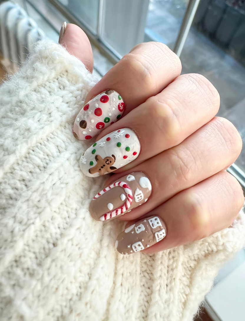 Warm, cozy, and full of charm, this manicure feels like Christmas morning. With gingerbread men, candy canes, and snowy little houses, it’s playful while still keeping a chic neutral base. It’s like having a holiday village at your fingertips.