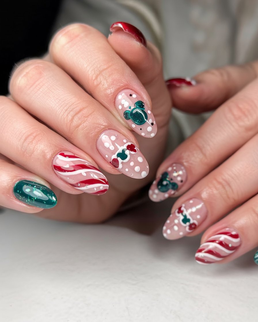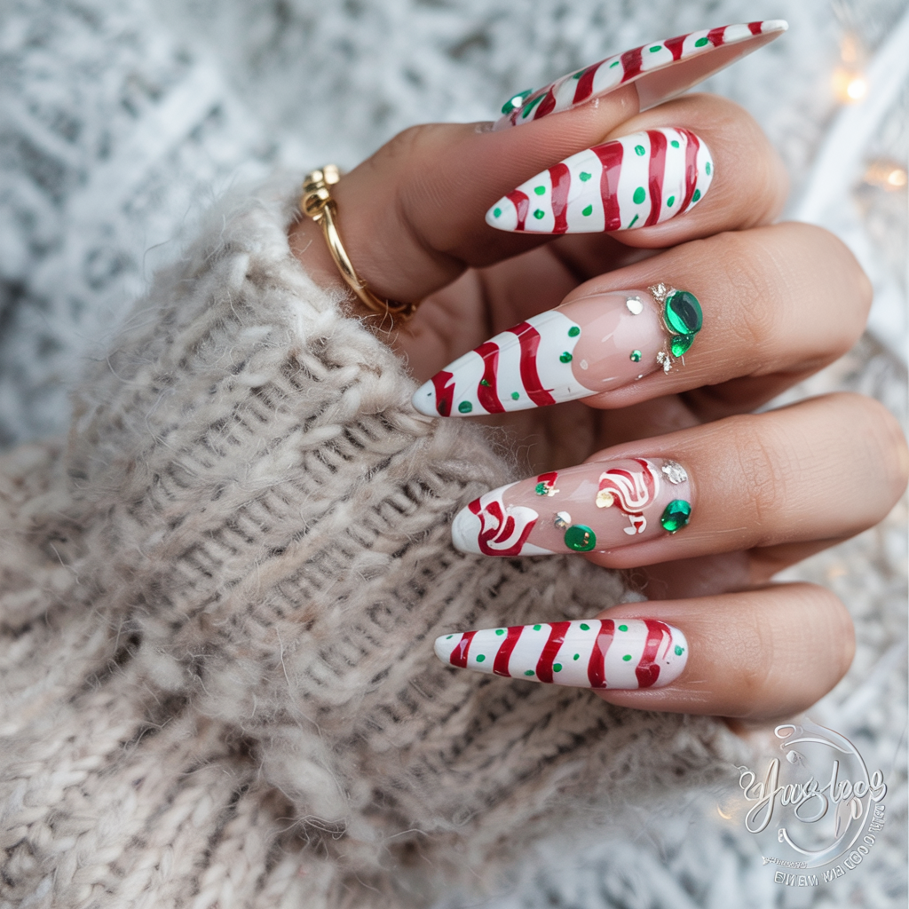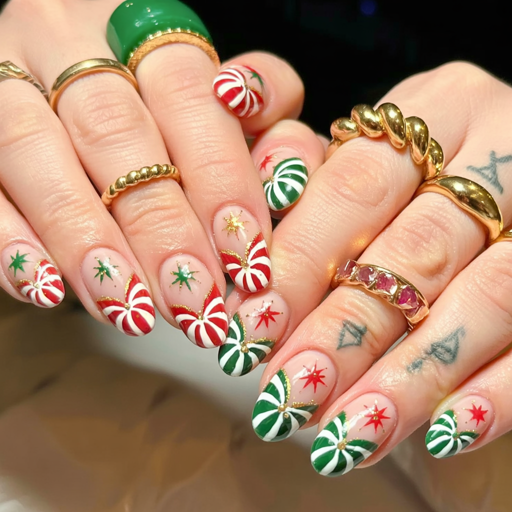 This style shines best on almond nails since the curved shape enhances the swirl designs and creates a candy-like effect. It’s a great choice if you love long-lasting acrylic or gel nails, as they provide the perfect base for such intricate detailing. The mix of red and green colors is timeless for the season, ensuring your manicure looks both trendy and classic in 2025.