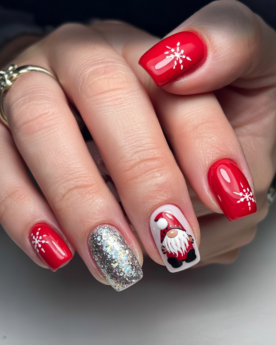 Outgoing and merry, the nails combine a classic red with silver glitter, along with an adorable Christmas gnome. Snowflakes give it a frosty feel, whereas gnome art leans towards a whimsical, almost storybook atmosphere.