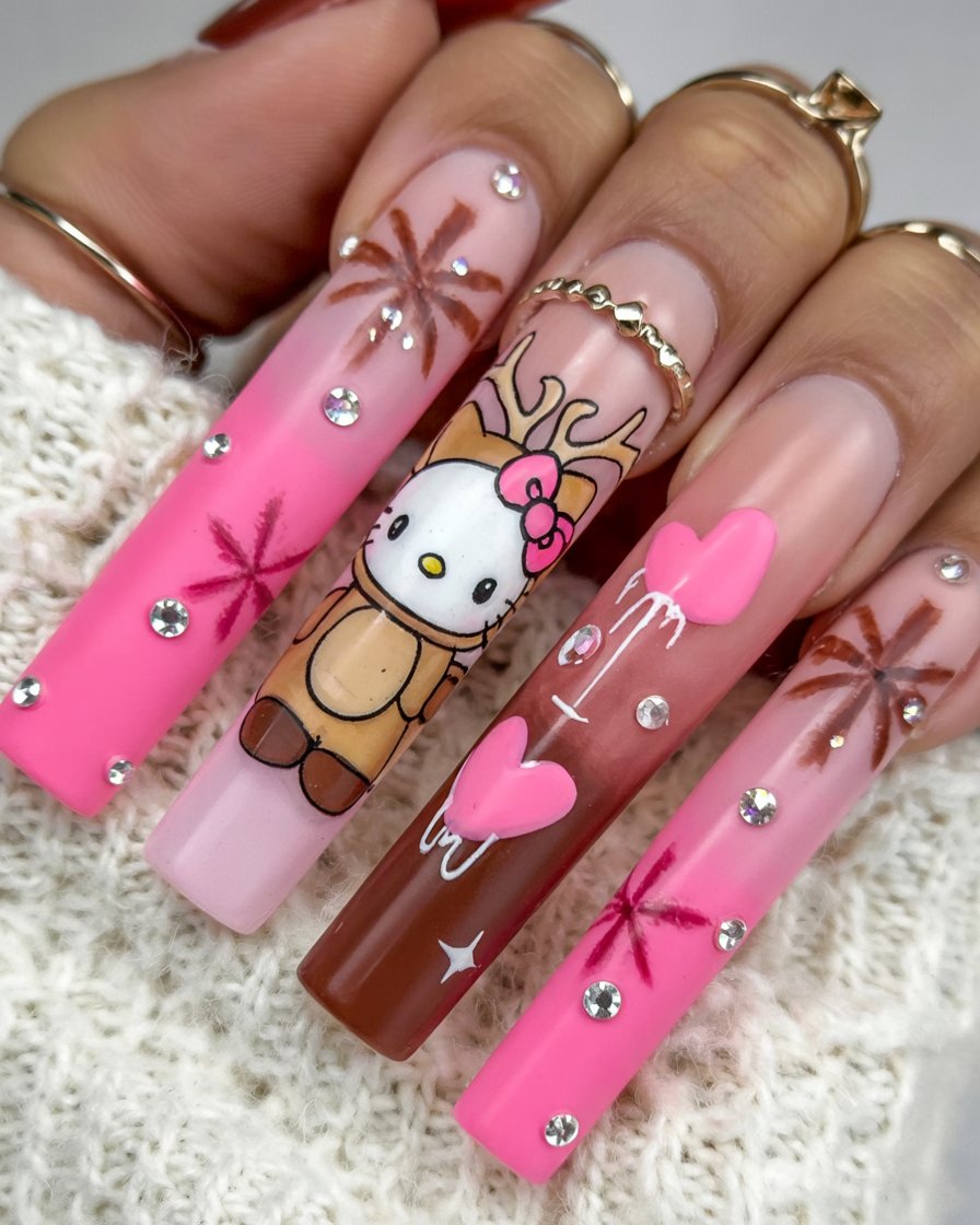 For those who just want more kawaii energy in their seasonal nails, these are like, totally adorable. Long pink acrylic nails adorned with rhinestones, snowflakes, hearts, and a reindeer Hello Kitty-they’re festive, girly, and completely entertaining. It’s like Christmas morning wrapped in sparkles and bows.
