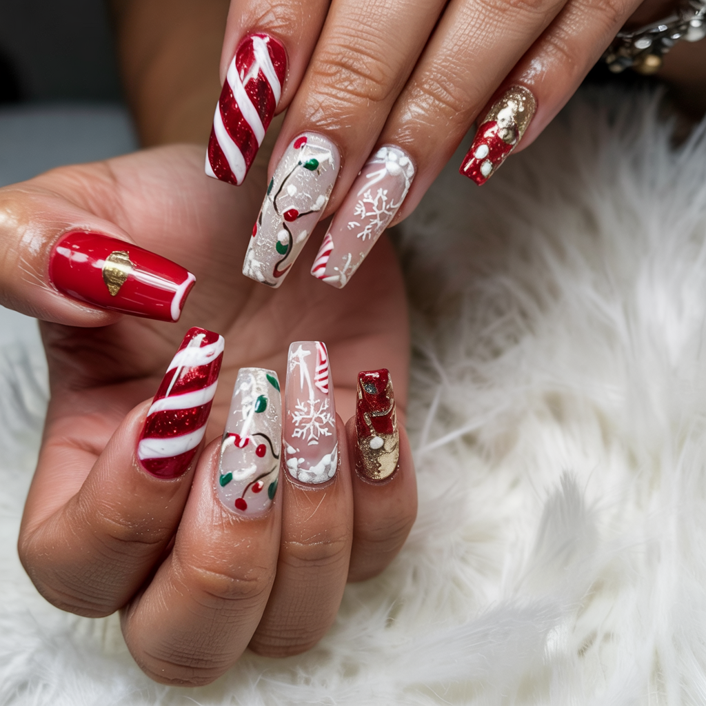 This kind of style is ideal if you want your nails to catch light during every holiday reunion. It fits medium square nails, especially for ladies who enjoy some fun art plus a little sparkle. Keep it simple in terms of clothing and let your nails shine, or go full-on festive with red lipstick and matching accessories.